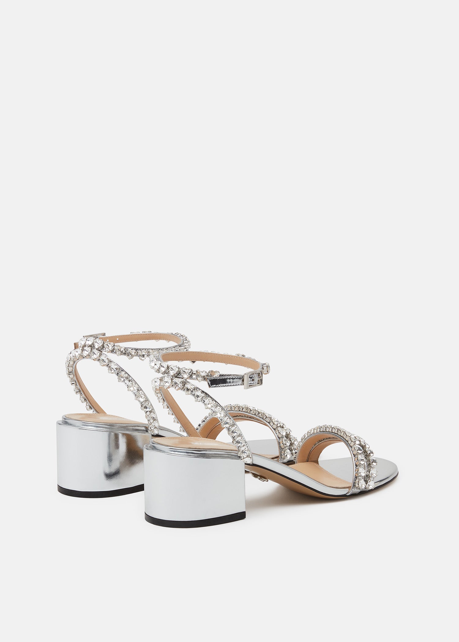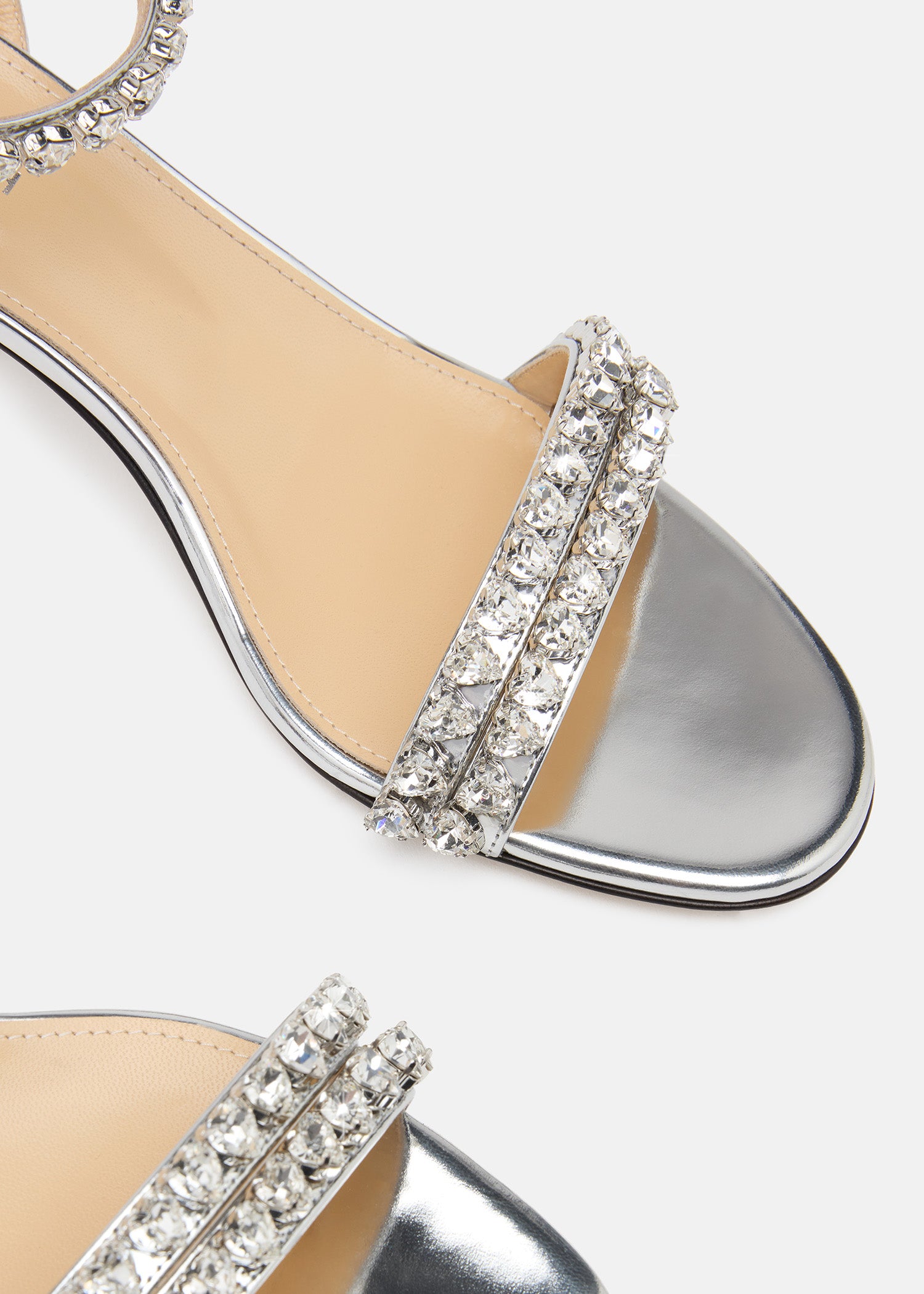 The Audrey Crystal Round-Toe Satin Sandals in Silver feature a luminous satin finish and crystal detailing. Designed with a 55mm heel, they add light-catching sleekness, crafted in Italy with a satin upper, leather lining, and calf leather sole. Pair them with a Double Bow clutch for an easy finish.