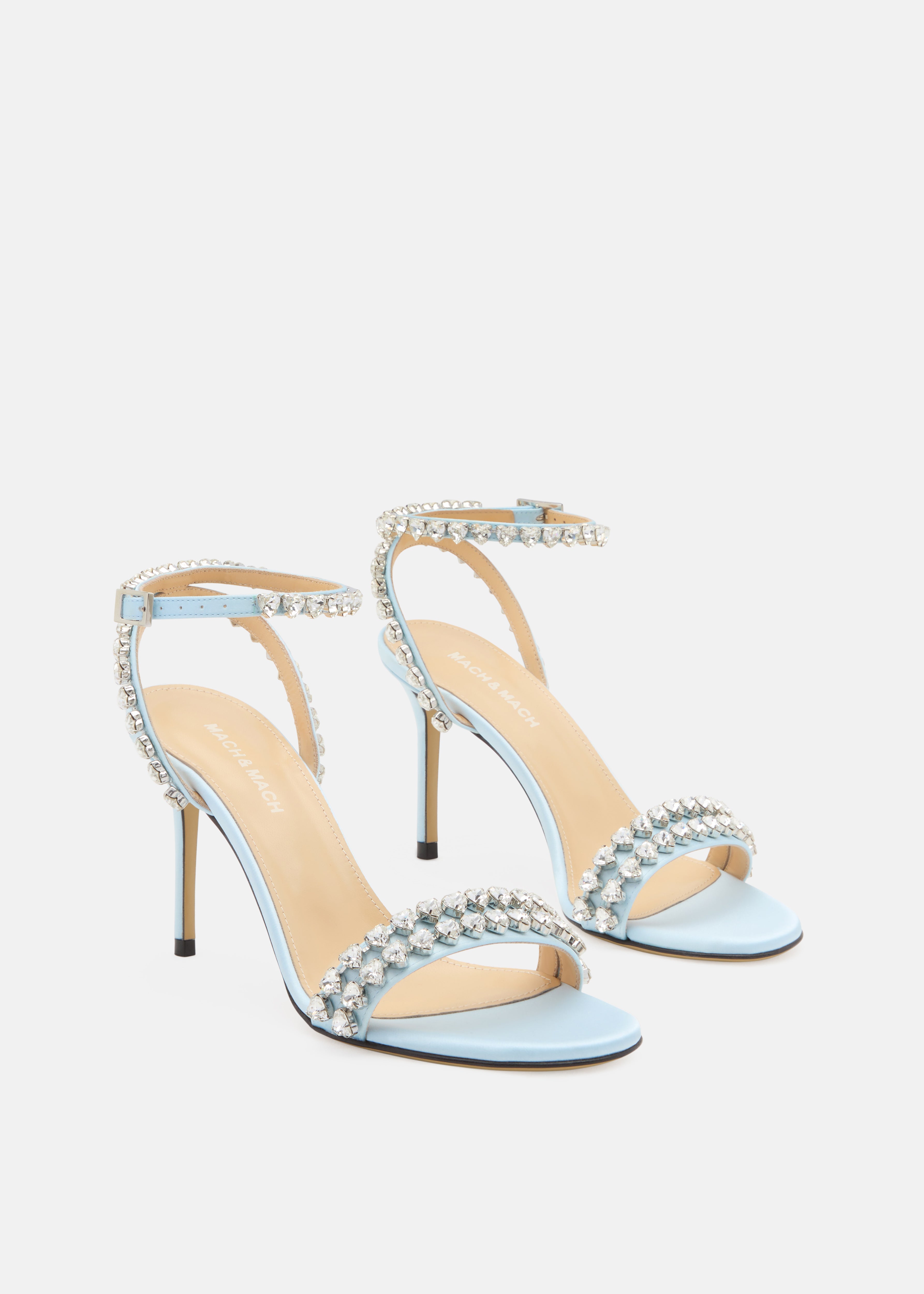The Audrey Crystal Round-Toe Satin Sandals in Sky Blue feature a smooth satin finish accented with crystal details. Designed with a 95mm heel, they balance softness and shine with ease, crafted in Italy with a satin upper, leather lining, and calf leather sole. Pair them with a Double Bow clutch to keep the look clean.